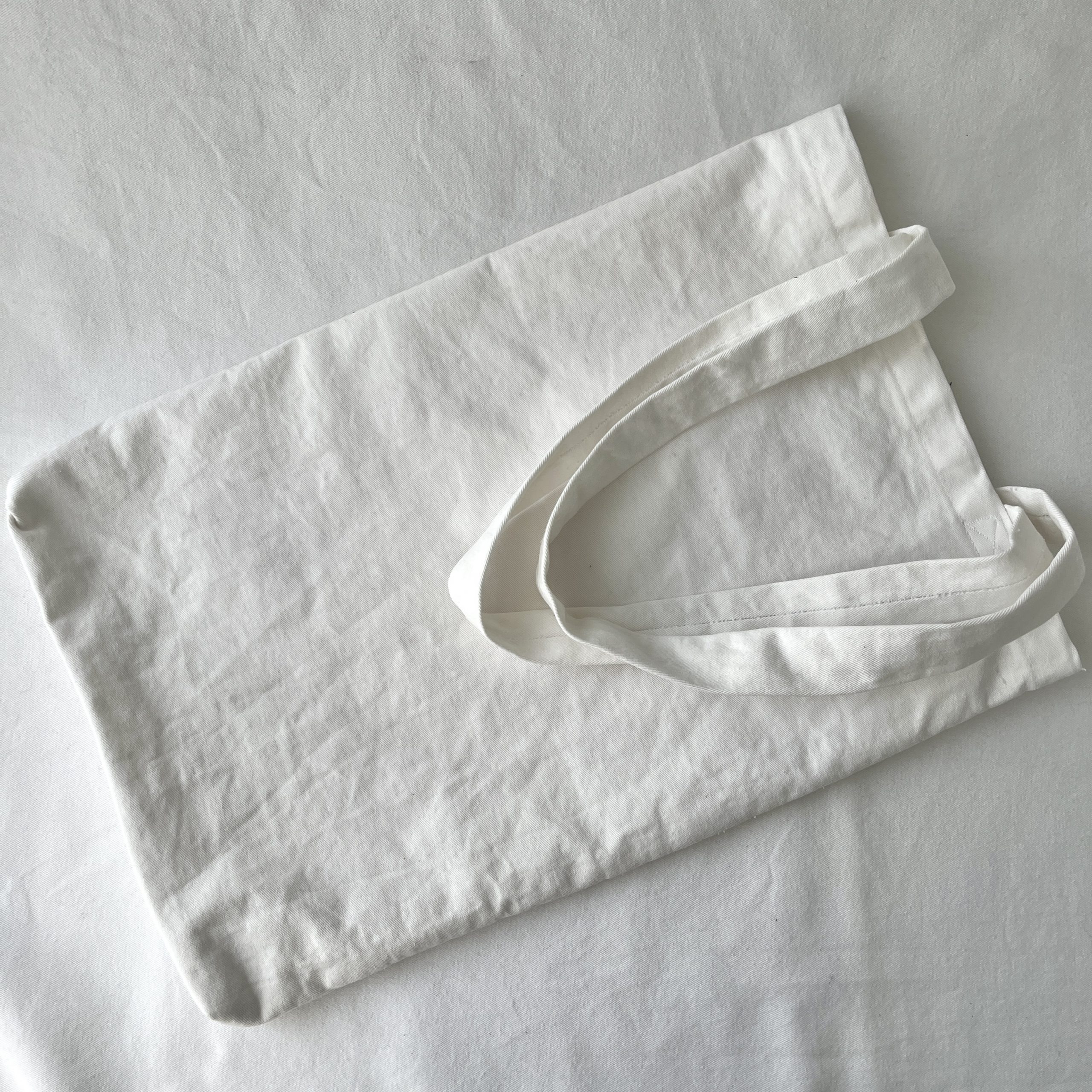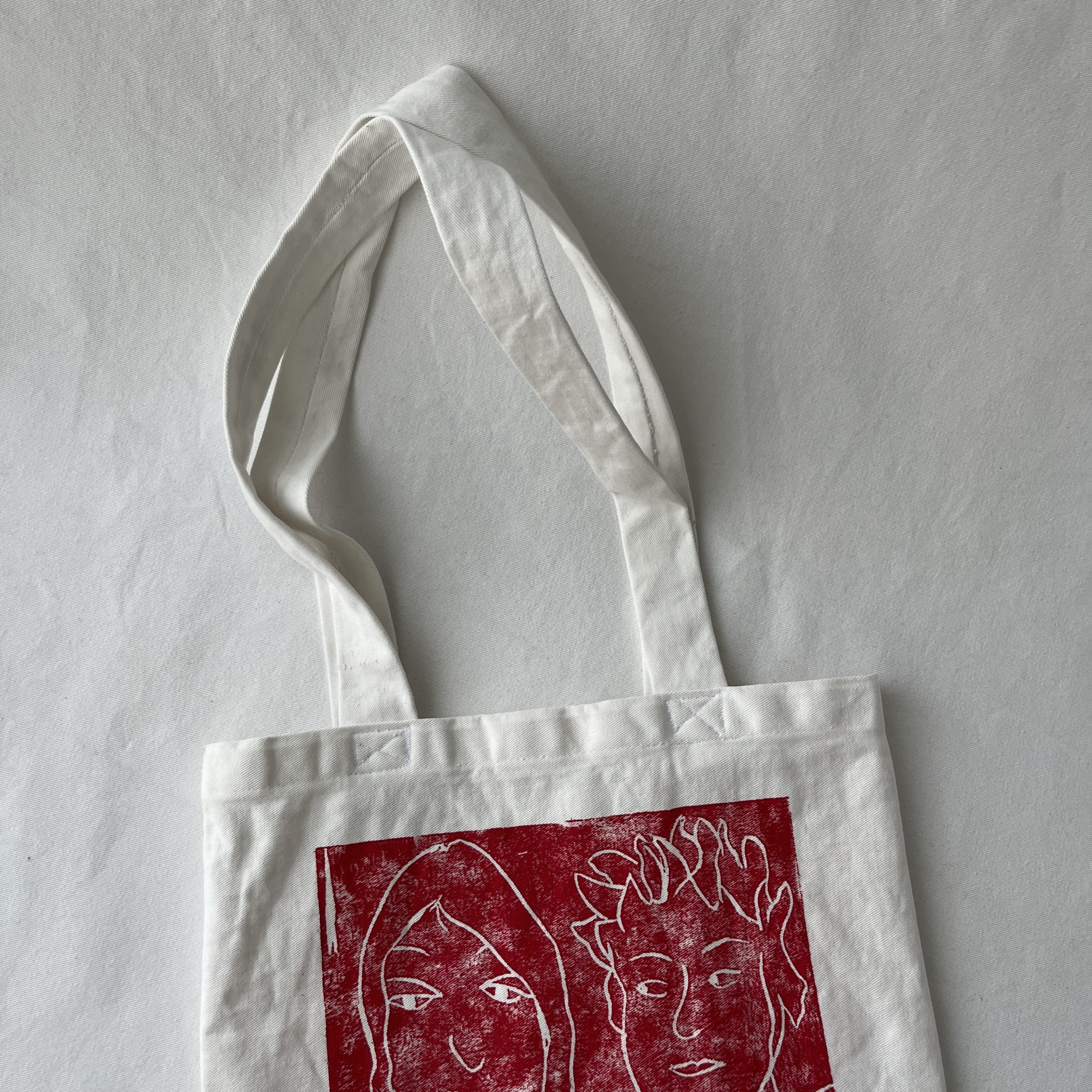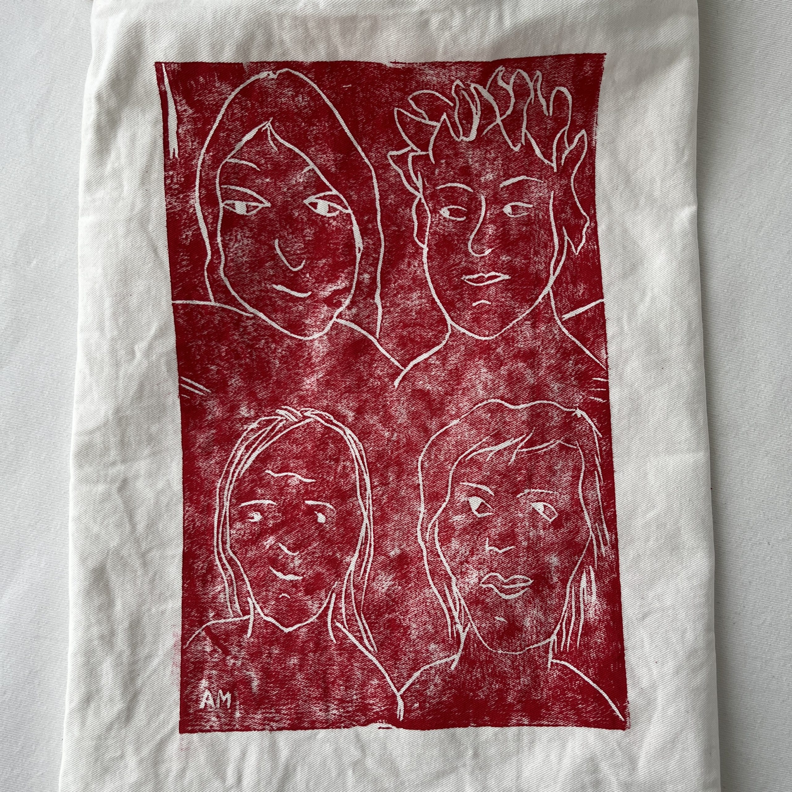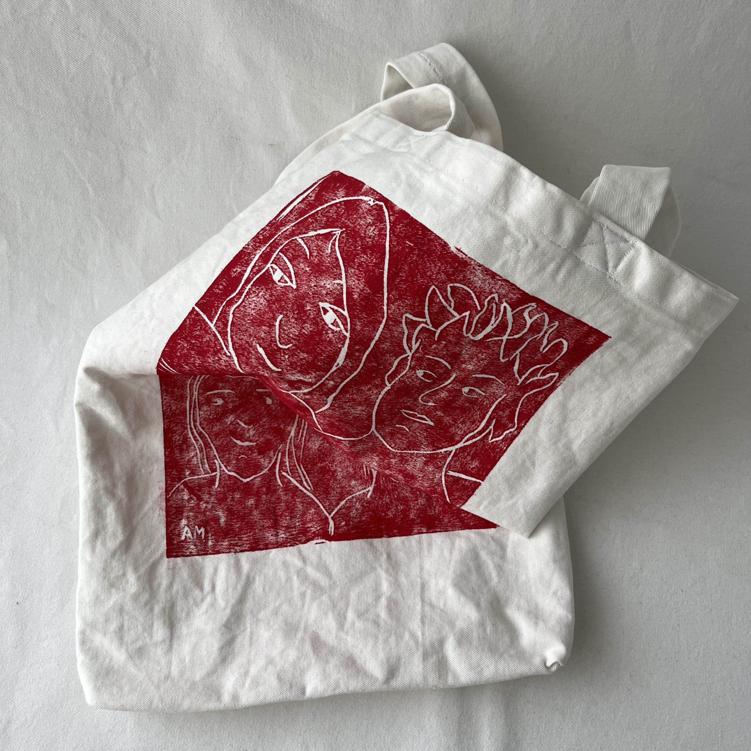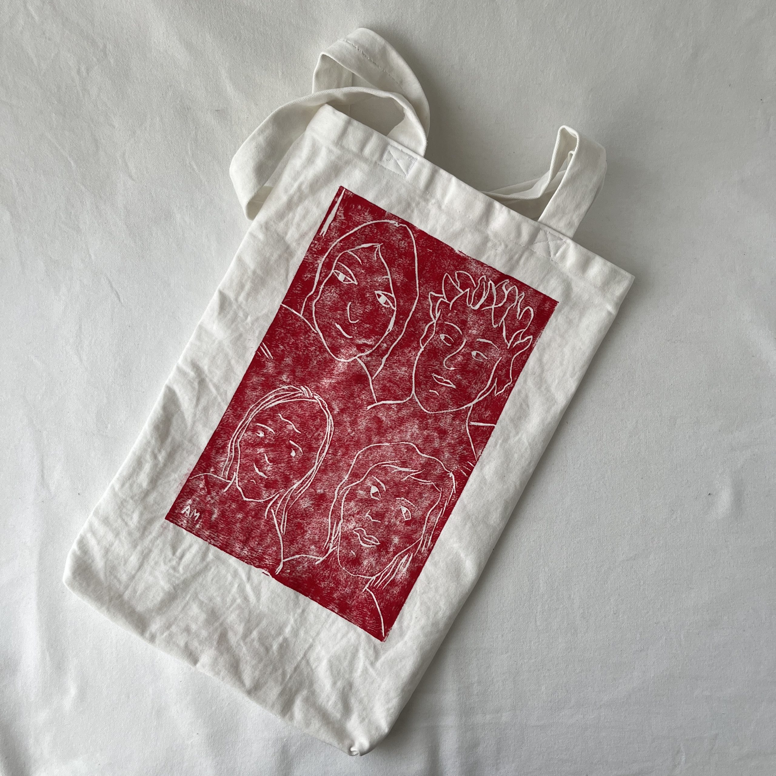 Die Face-it3 ist aus festem Baumwollstoff, einem ehemaligen Vorhang, und mit einem Linoldruck versehen. Die Tasche hat eine längliche Form, man könnte sagen sie hat Überlänge.