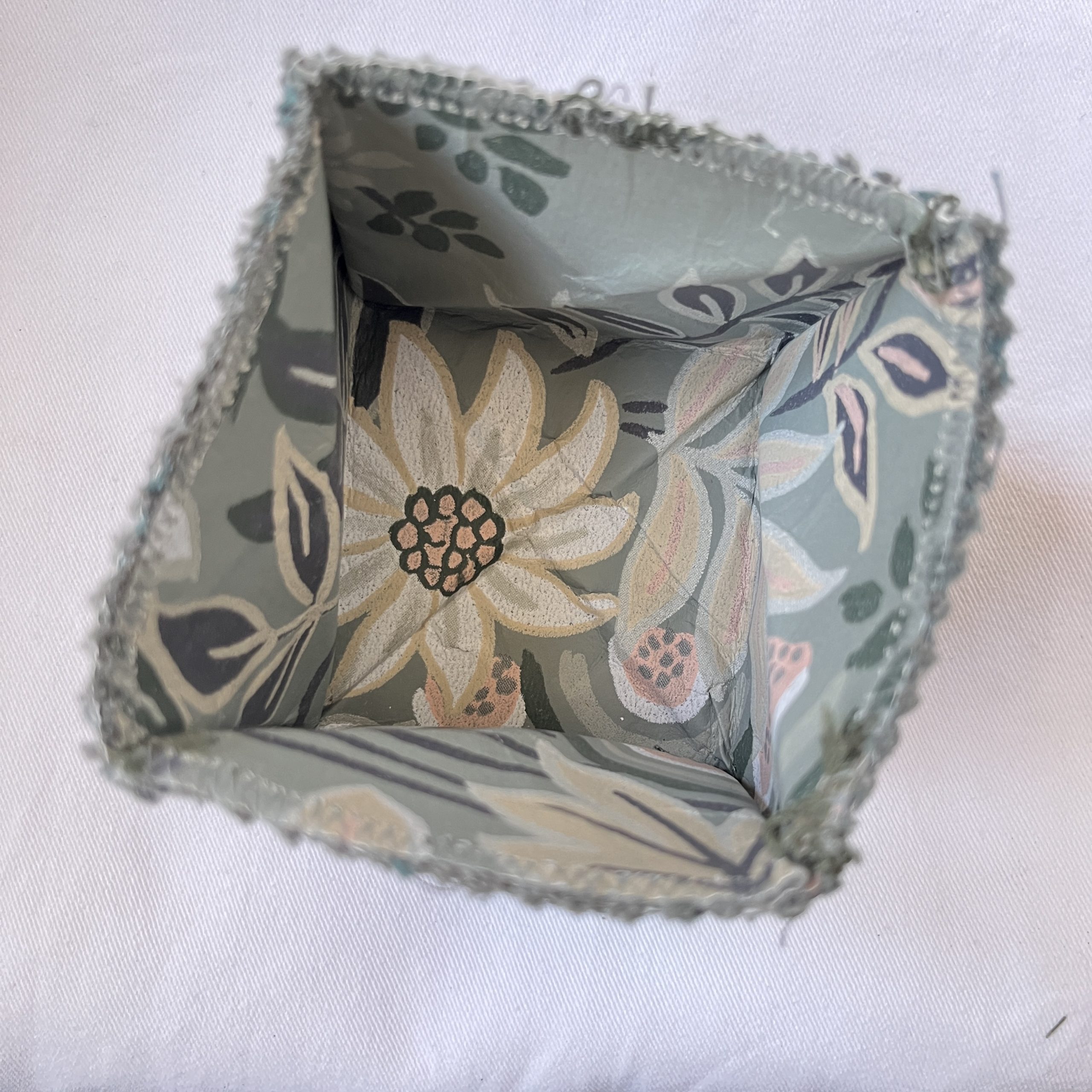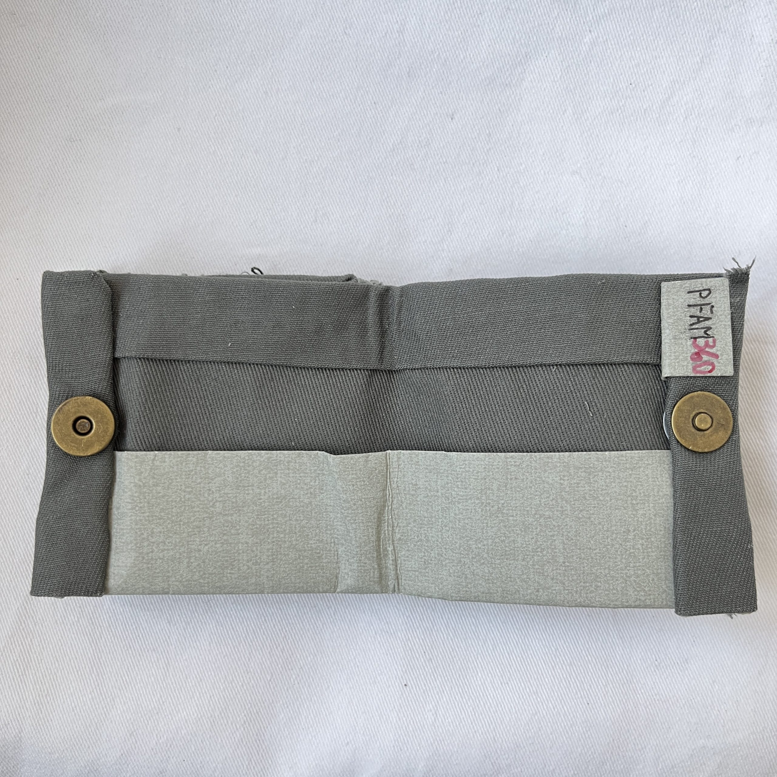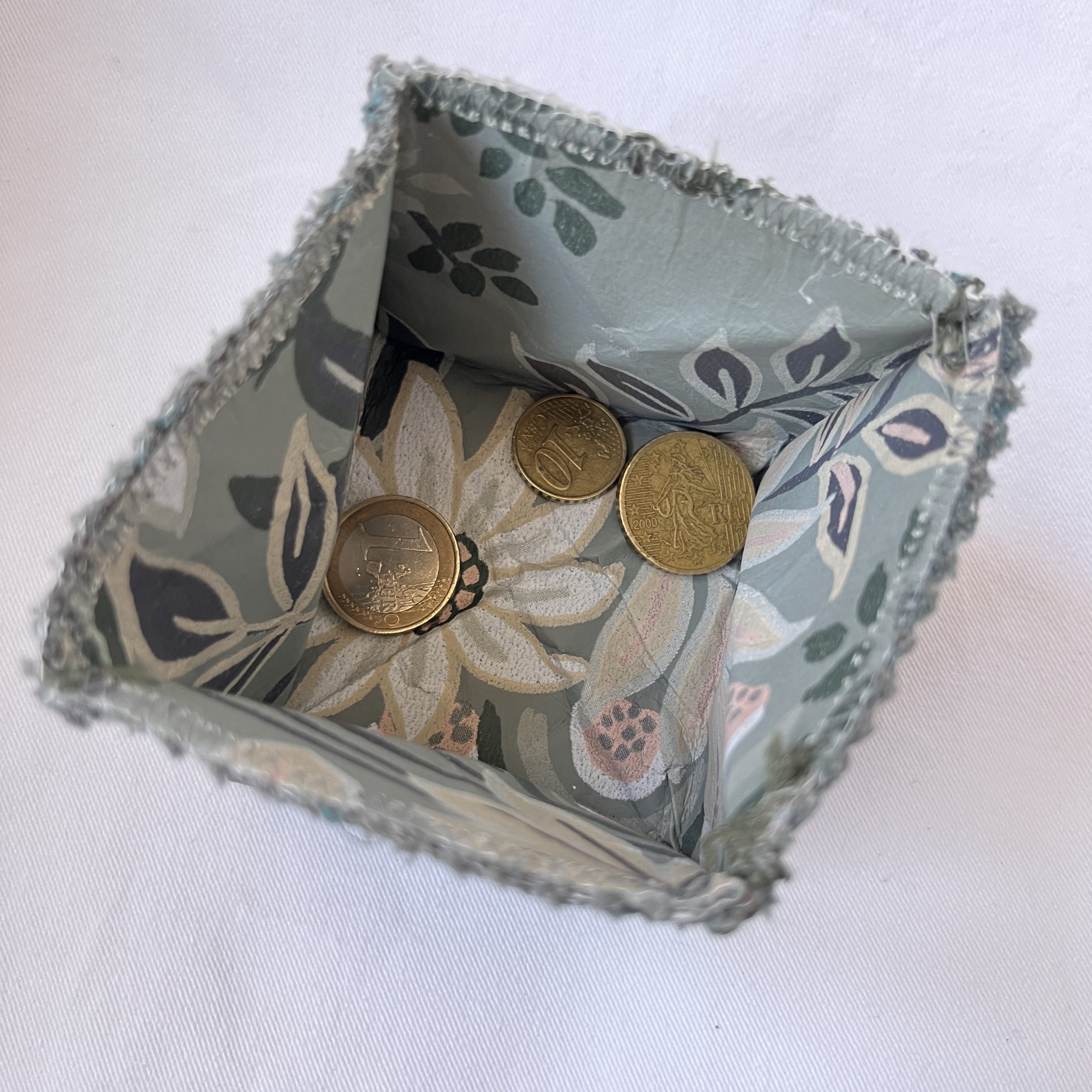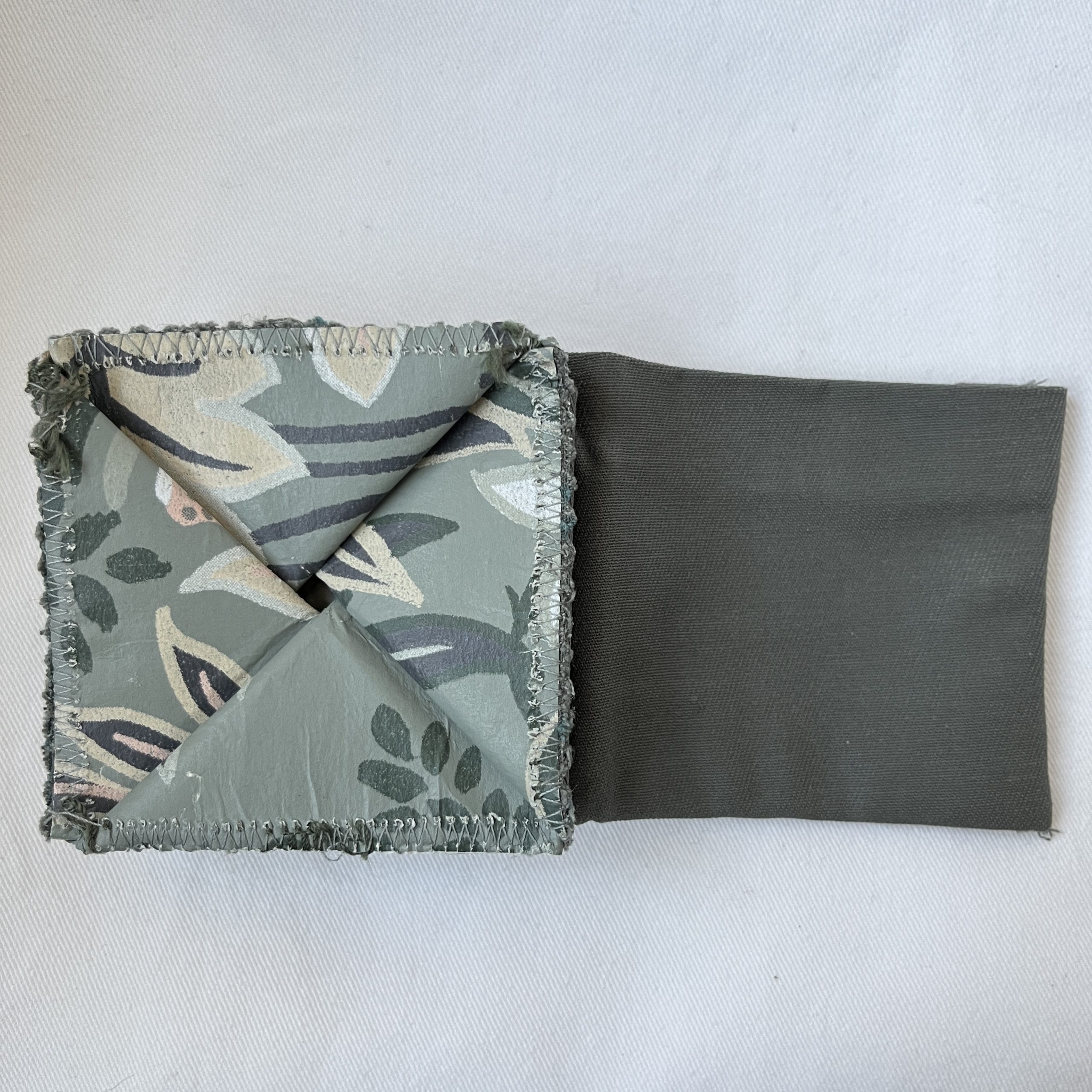 | Material | Oberstoff : Zusammensetzung unbekannt, Innenstoff: 100% Baumwolle, Druckknopf: Metall Mit Ausnahme des Nähgarns und des Druckknopfes wurde das Portemonnaie aus aussortierten Materialien, also ressourcenschonend hergestellt. So ist z.B. der Oberstoff aus Tapetenvlies. |