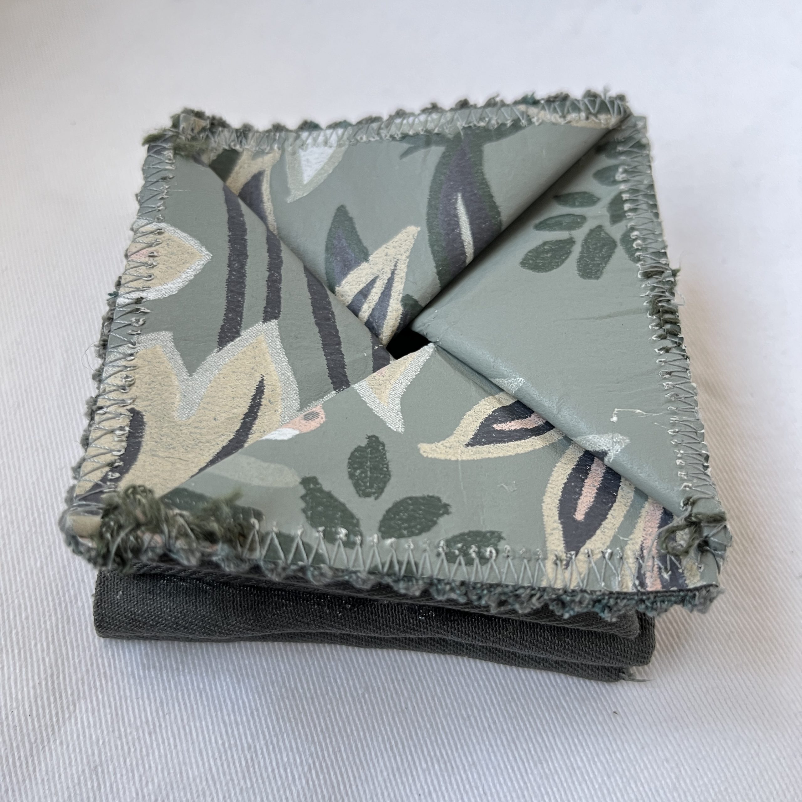 Das Faltportemonnaie aus den Siebzigern als Inspiration! Hier mit zusätzlichem Geldscheinfach. Mit Origamifalttechnik aus Tapetenvlies und festem Baumwollstoff in Form gebracht und anschließend vernäht. Außer dem Markennähgarn und dem farblich passenden Magnetdruckknopf besteht das Ori-P 3 aus wiederverwerteten Materialien.
