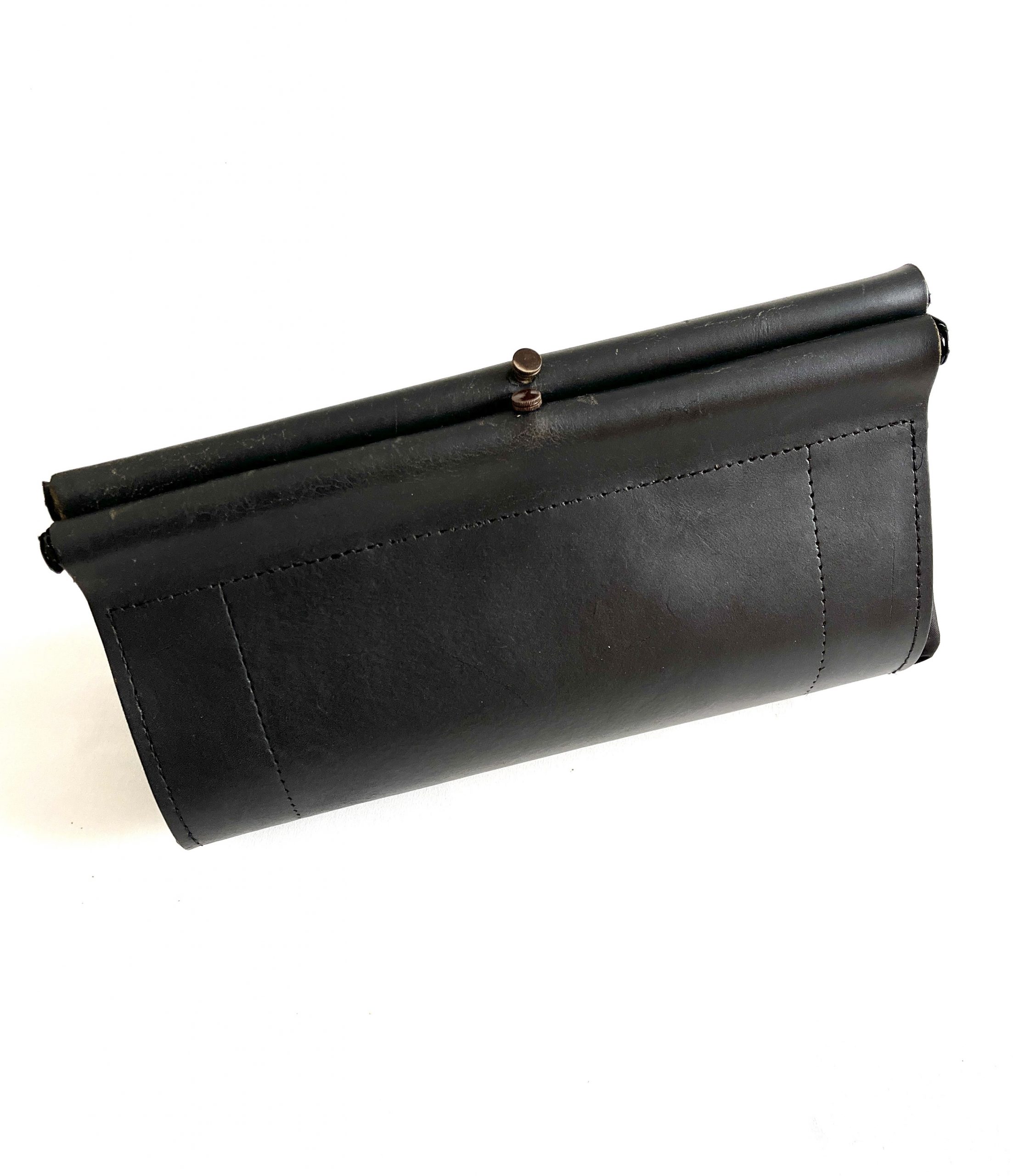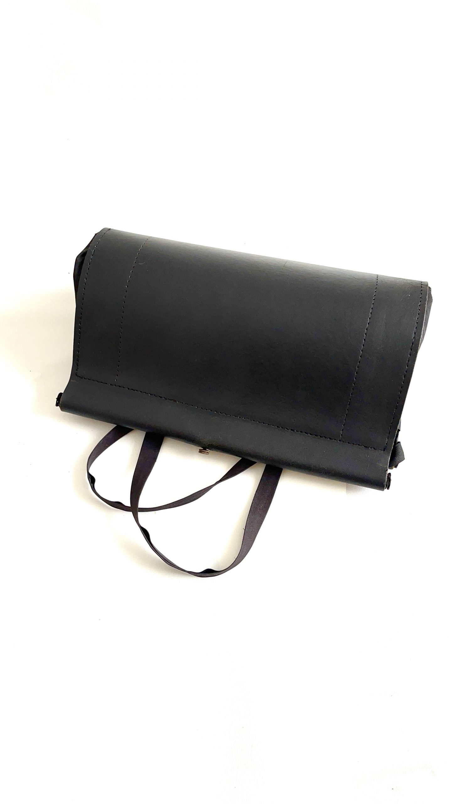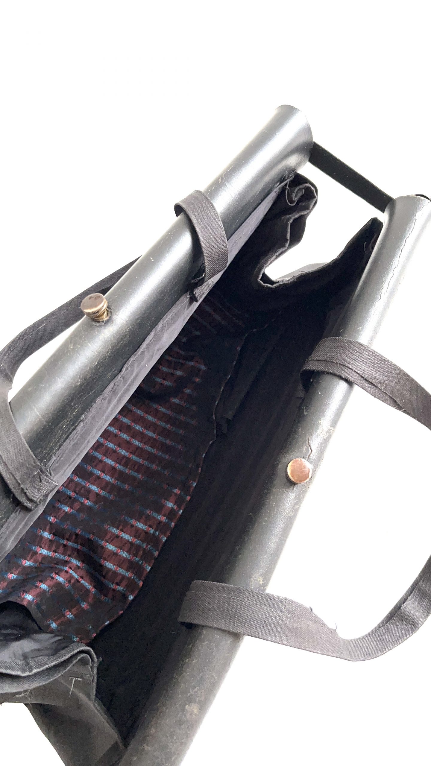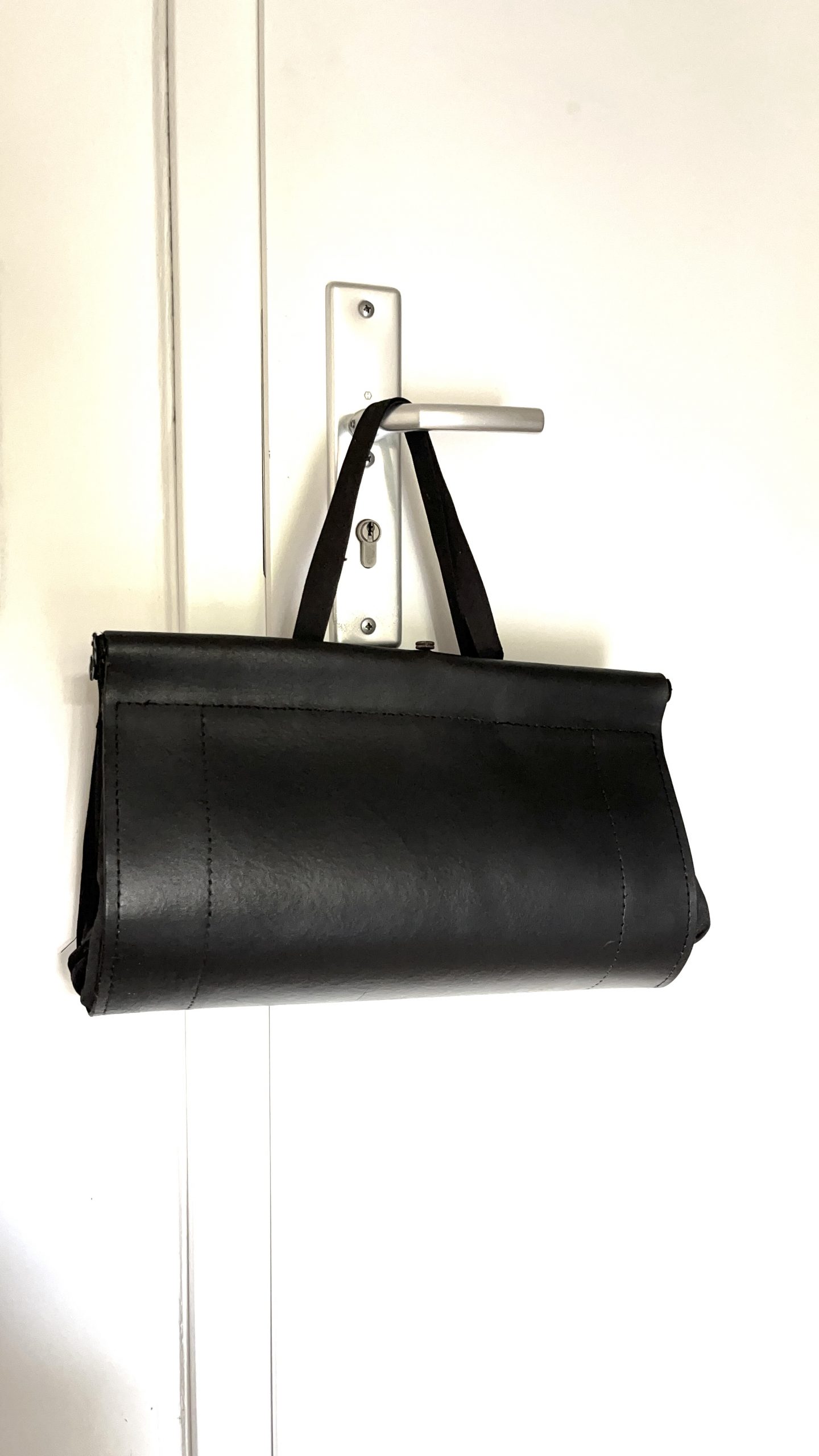 Die handvernähte robuste dunkelbraun-schwarze Lederstasche hat einen Vintage-Look. Die Seiten sind aus festem anthrazitfarbenen Stoff. Das Innenfutter ist blau-rot-bräunlich glänzend und gibt der Tasche einen erfrischenden Akzent. Im Boden des Hauptfaches befindet sich ein mit Klettverschluss befestigtes flaches Fach. Ein weiterer Akzent sind runde Zierknöpfe einer ehemaligen Nähmaschine. Die Tasche kann durch Ziehen geöffnet werden. Ein Gummi, dass entlang die im Leder versteckten runden Querstangen gezogen ist, sorgen für einen sehr einfachen Schließmechanismus: Mal eben kurz etwas herausnehmen, kein Problem. Stylisch ist die Tasche lässig unter den Arm geklemmt. Soll die AT1 mal über der Schulter getragen werden, können die innenliegenden schmalen Träger genutzt werden.