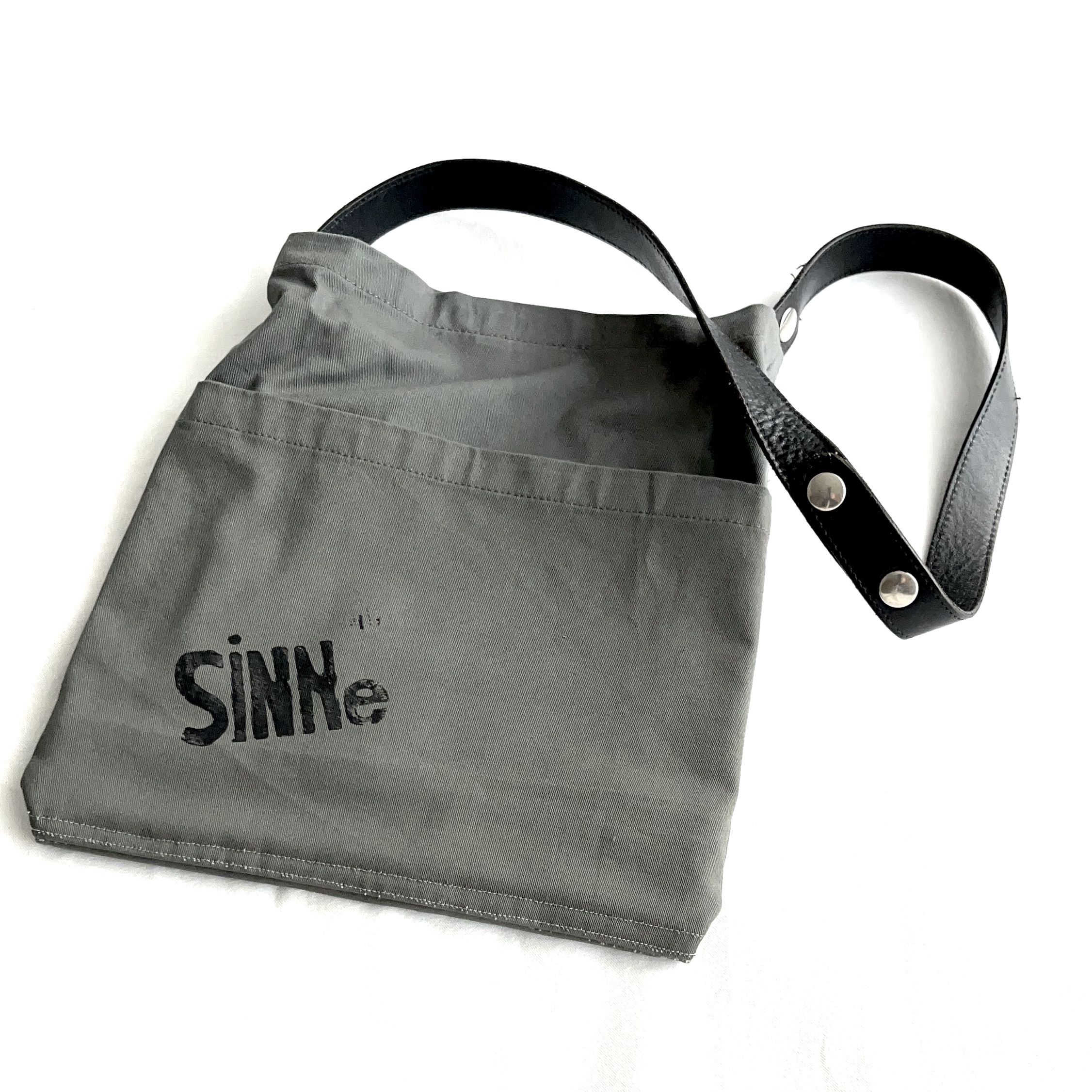 Diese lässige Tasche ist stabiler als ein Leinenbeutel, da sie aus doppelten und vierfachen Stoffschichten besteht. Die Vierfachschicht ist durch eine Falttechnik entstanden durch die sich gleichzeitig das praktische Außenfach ergeben hat. Das Hauptfach ist mit einem Klettverschluss verschlossen. Der Trageriemen ist aus festem Leder und lässt sich mittig öffnen. Das Wort SINNe ist mit Linoldruck angebracht. Die Sinne machen Sinn 😉
