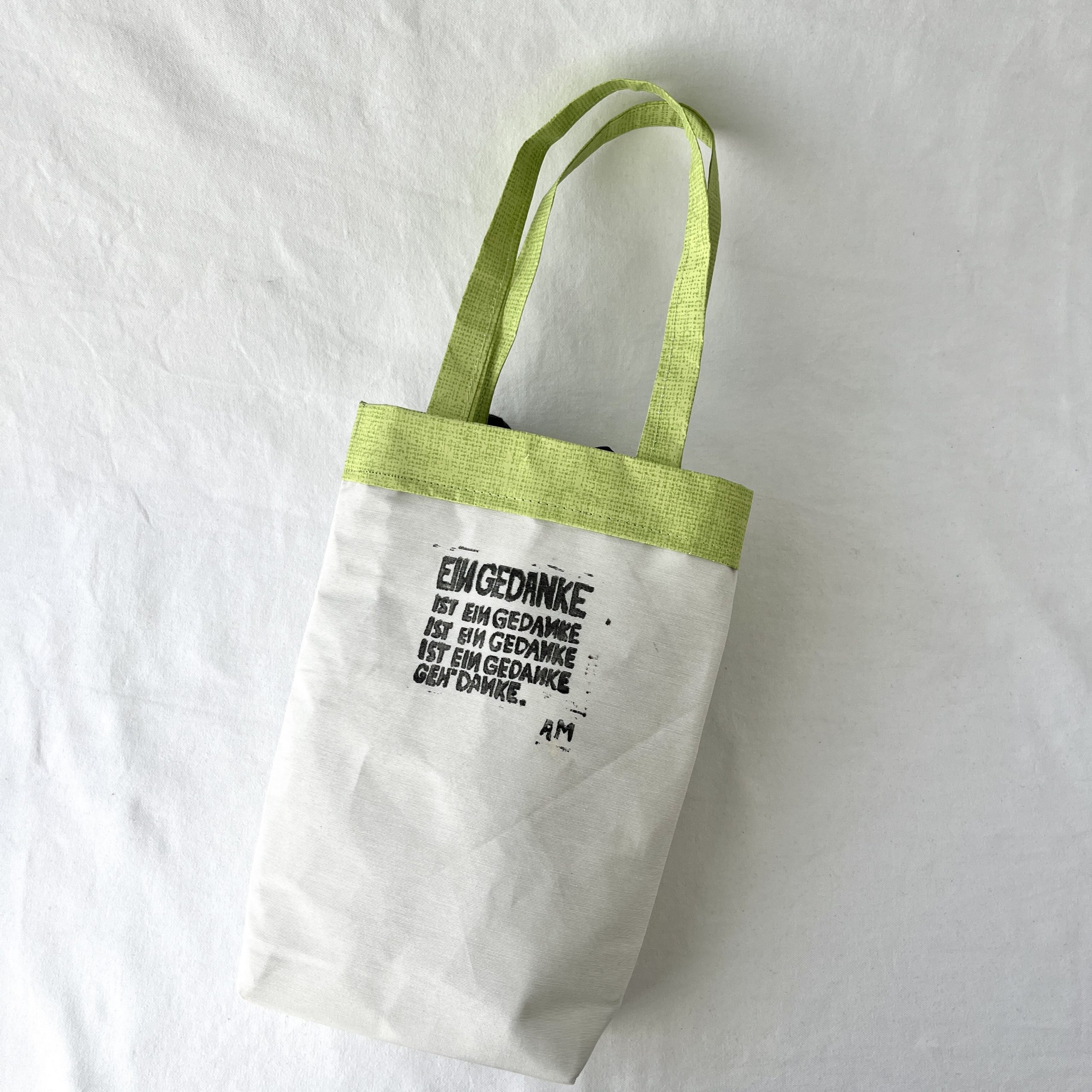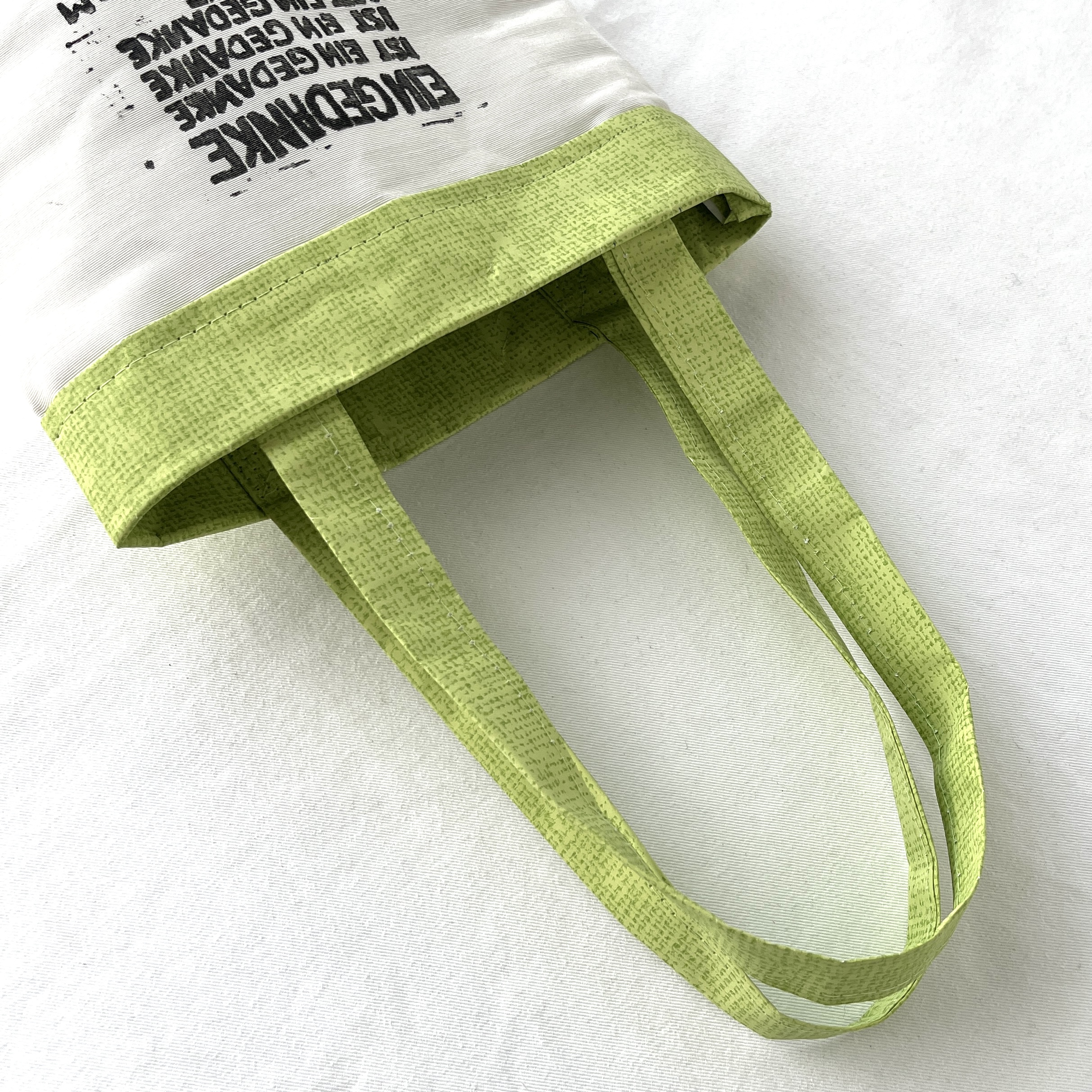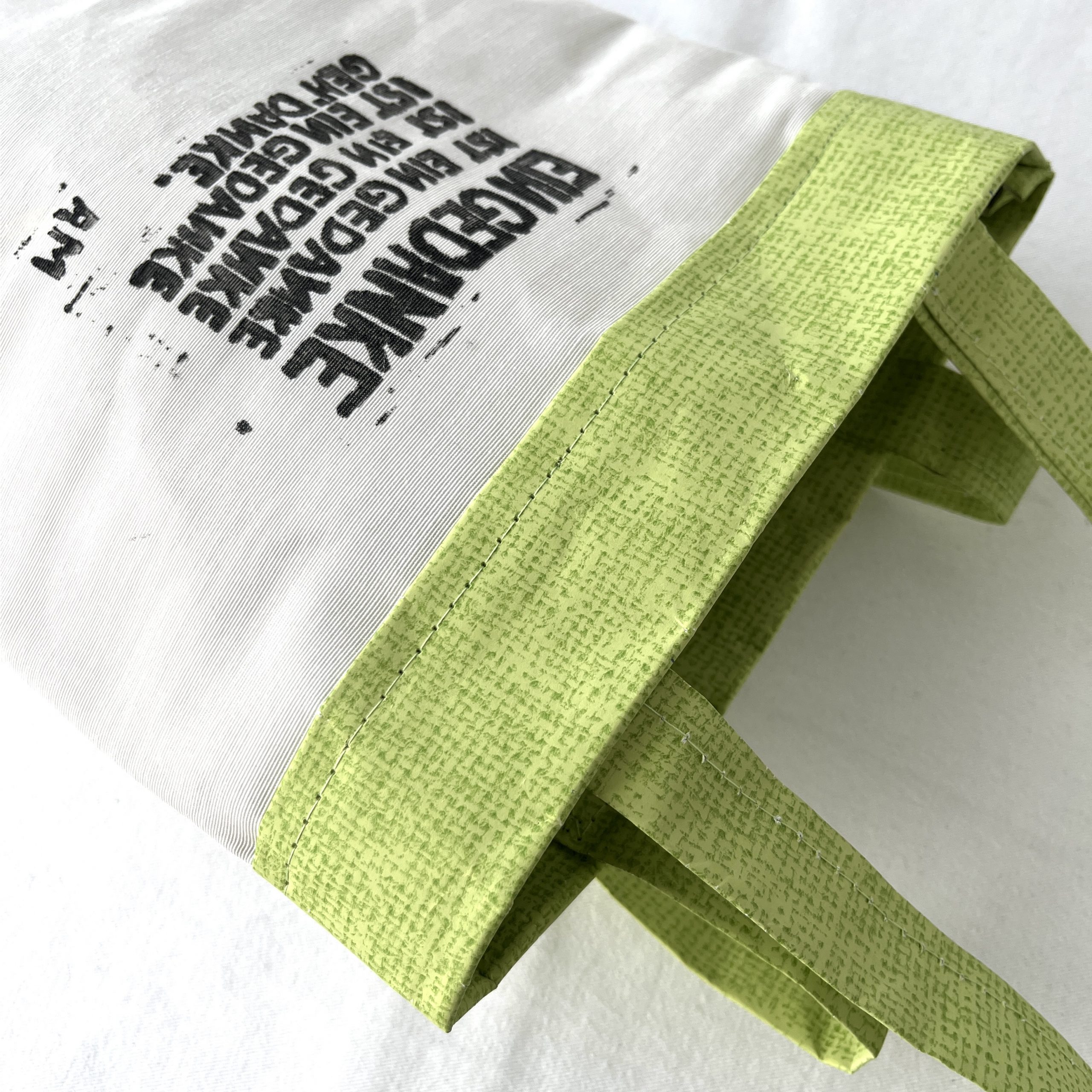 Die wORT3 ist leicht und praktisch. Sie besteht aus feucht abwaschbaren Tapetenvlies in frischem Grün und einer hellen Außenhaut aus festem Rollostoff. Dieser Beutel ist leicht und praktisch. Der Linoldruck erinnert daran, mehr in sich hinein zu spüren und die Gedanken im Zaum zu halten. 😉